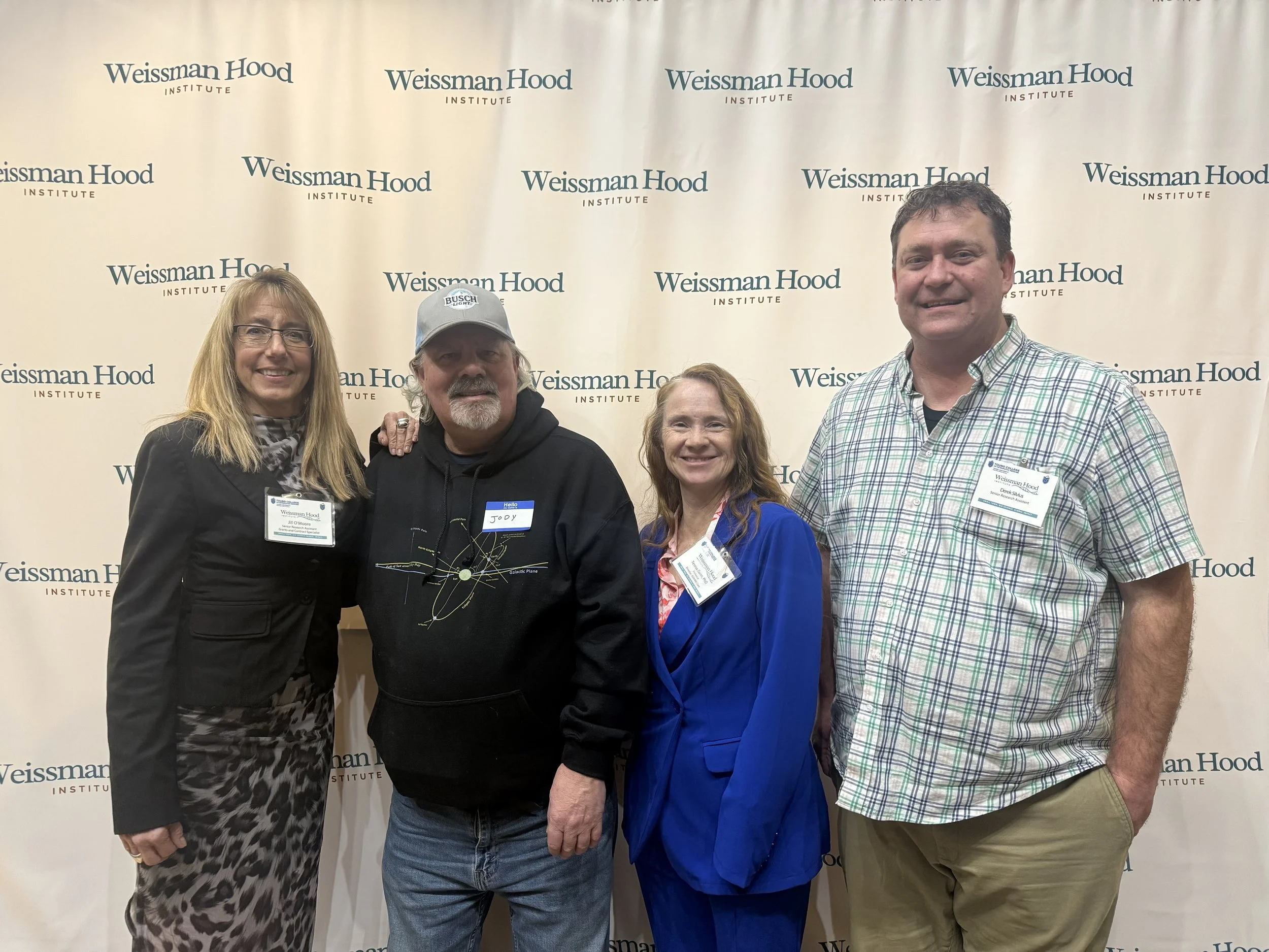 Dr. Teresa Gunn (center right in blue suit), and colleagues Jill O’Moore, Jody Thorsell and Derek Silvius (left to right) celebrate her Career Achievement Award at the recent WHIT Open House on February 27, 2026.
